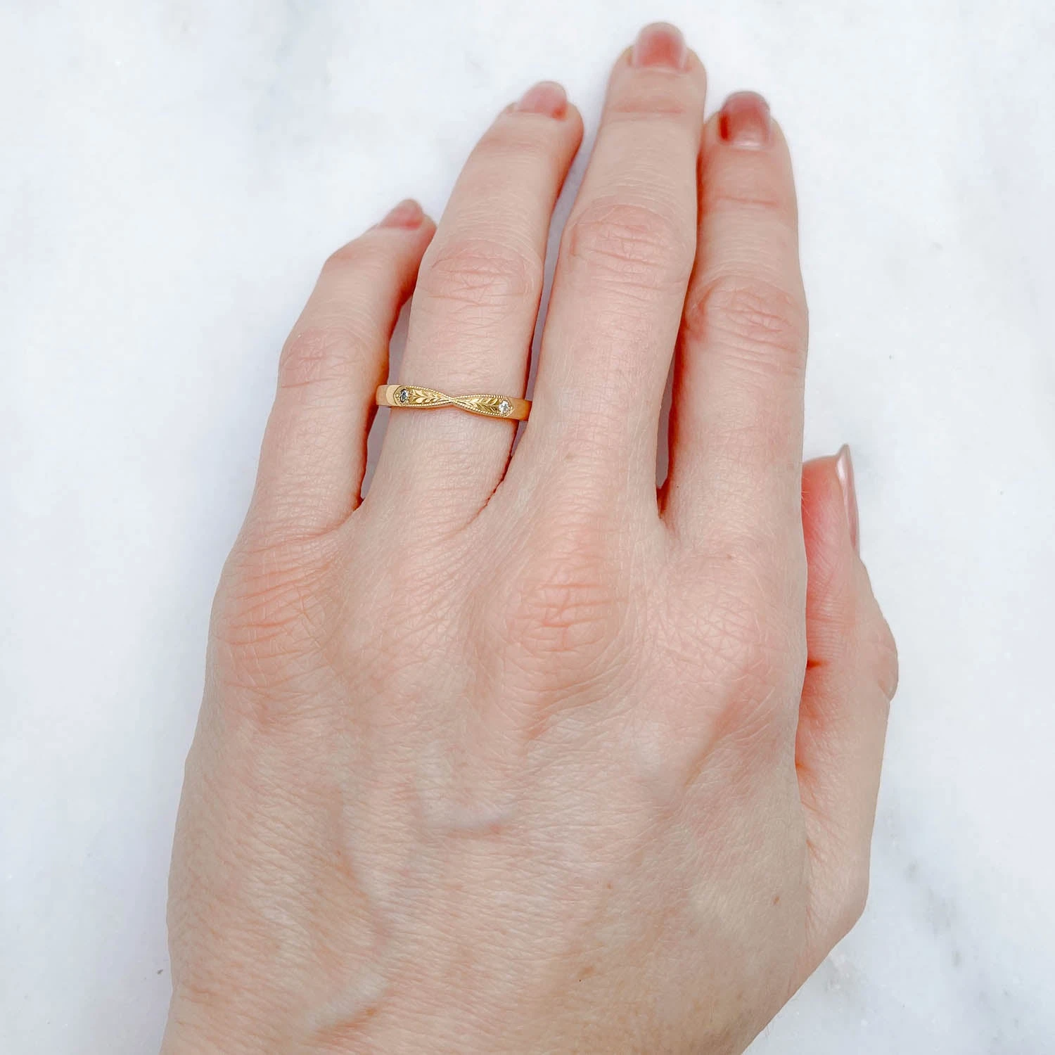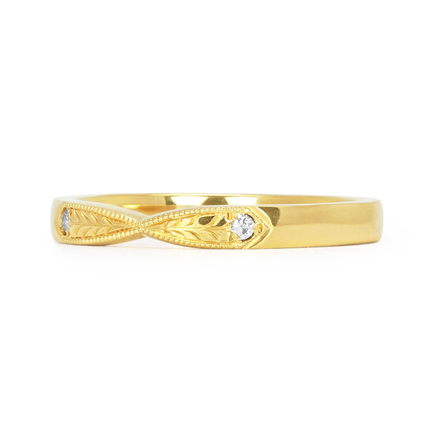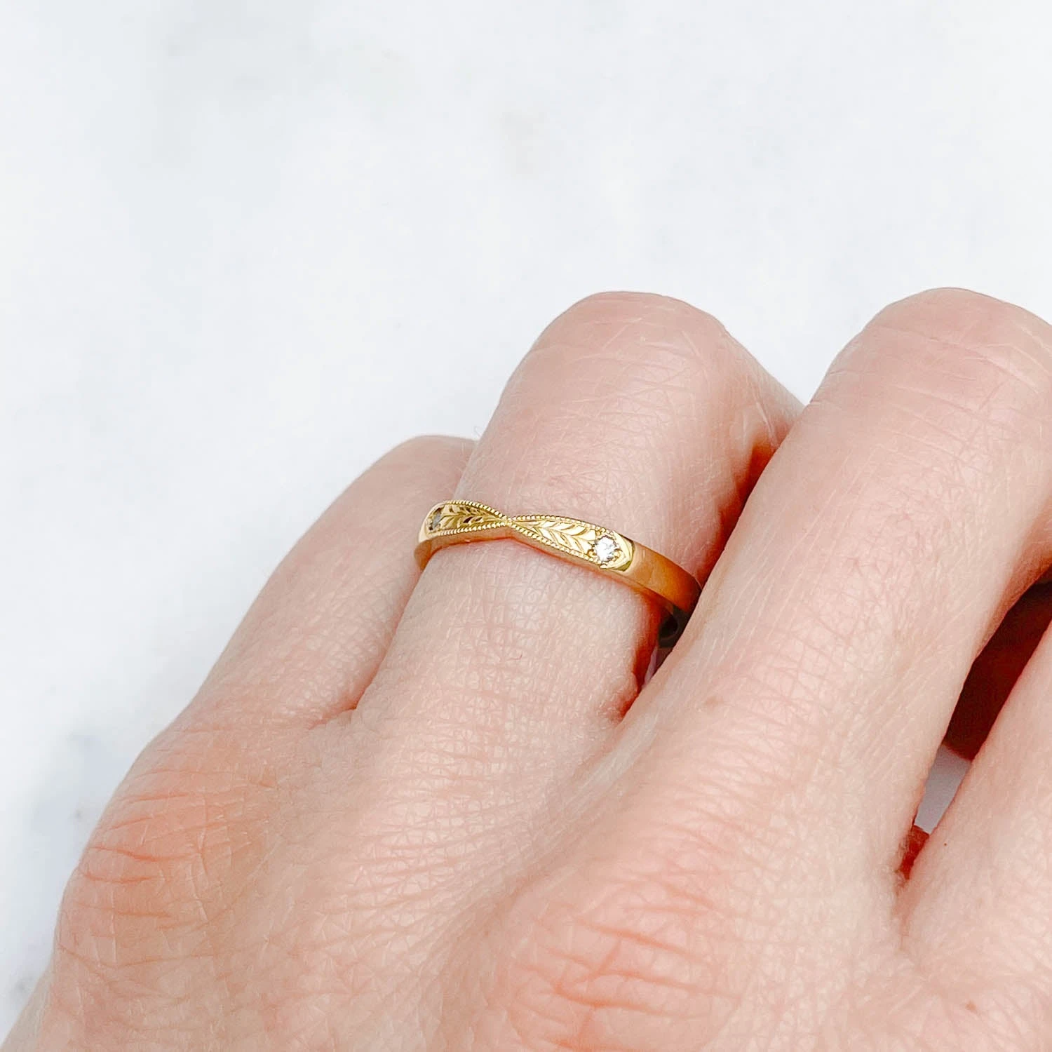 [SPLIT]Sometimes, less is more. This understated wedding band, with its subtle homage to a bygone era, is the perfect example of that. Its ‘pinched’ centre makes way for a neighbouring engagement ring, enabling a seamless and comfortable paring on the finger. Complete with the Lebrusan Studio signature of grain-set conflict-free diamonds and hand-engraved detail – a satisfyingly symmetrical laurel wreath motif on this occasion – this timeless and highly crafted wedding band carries itself tastefully.