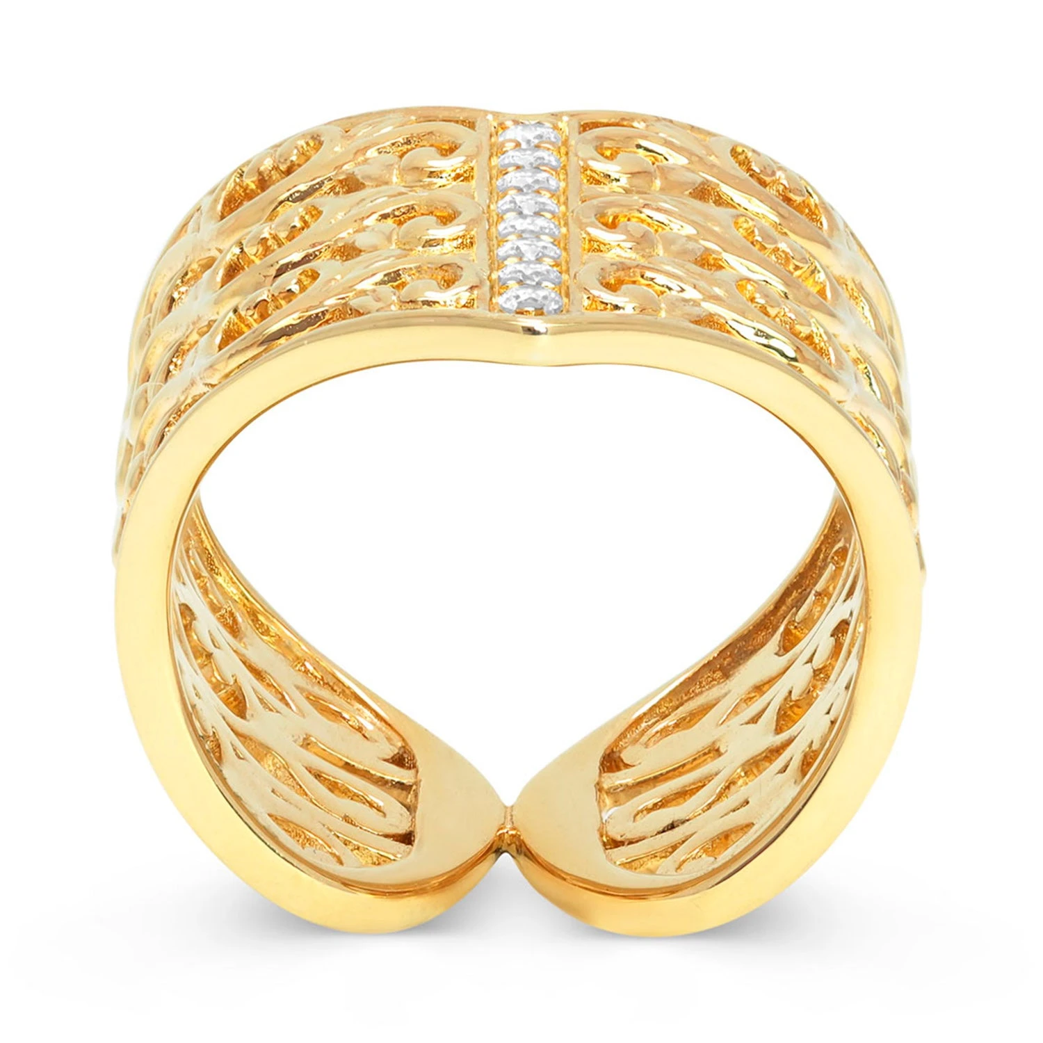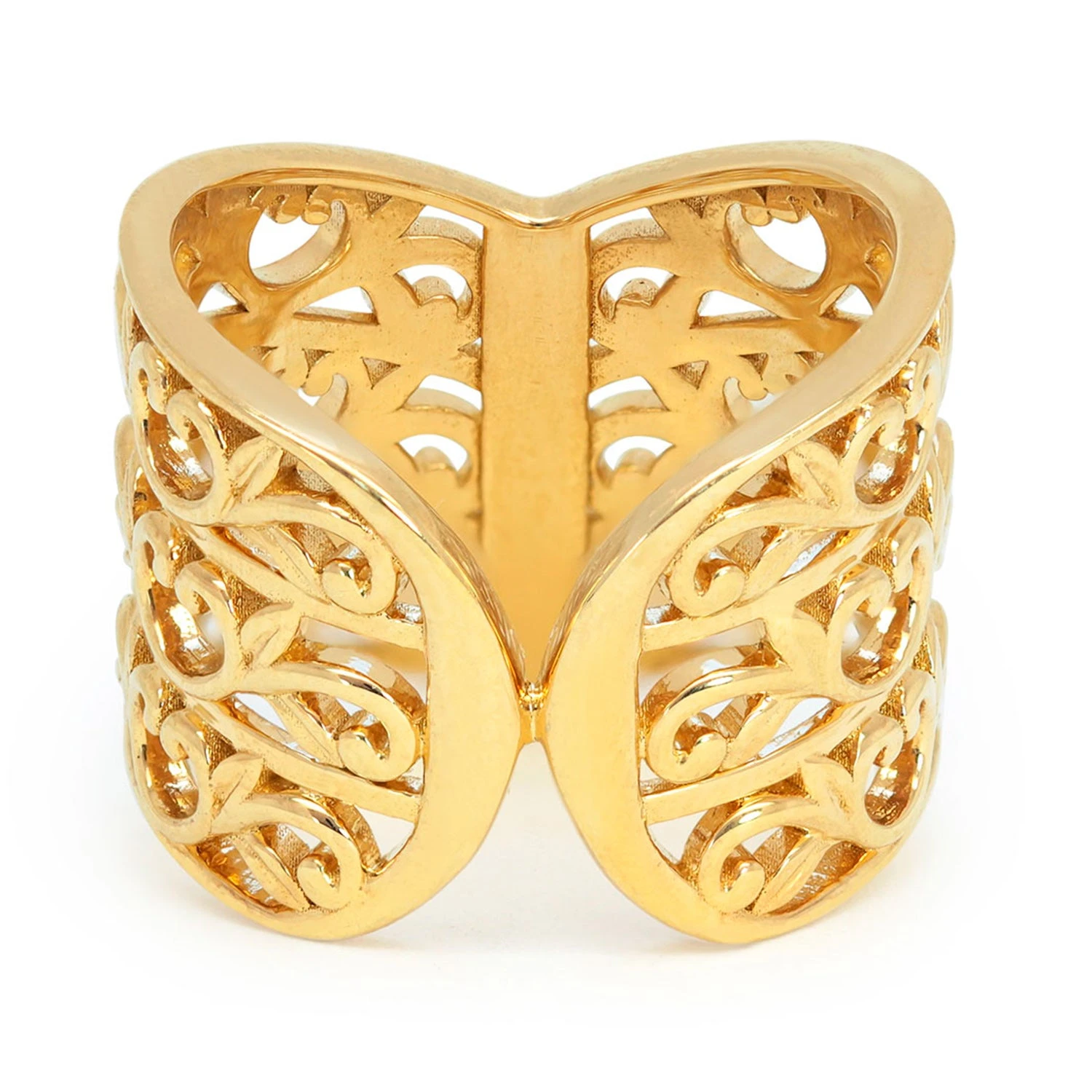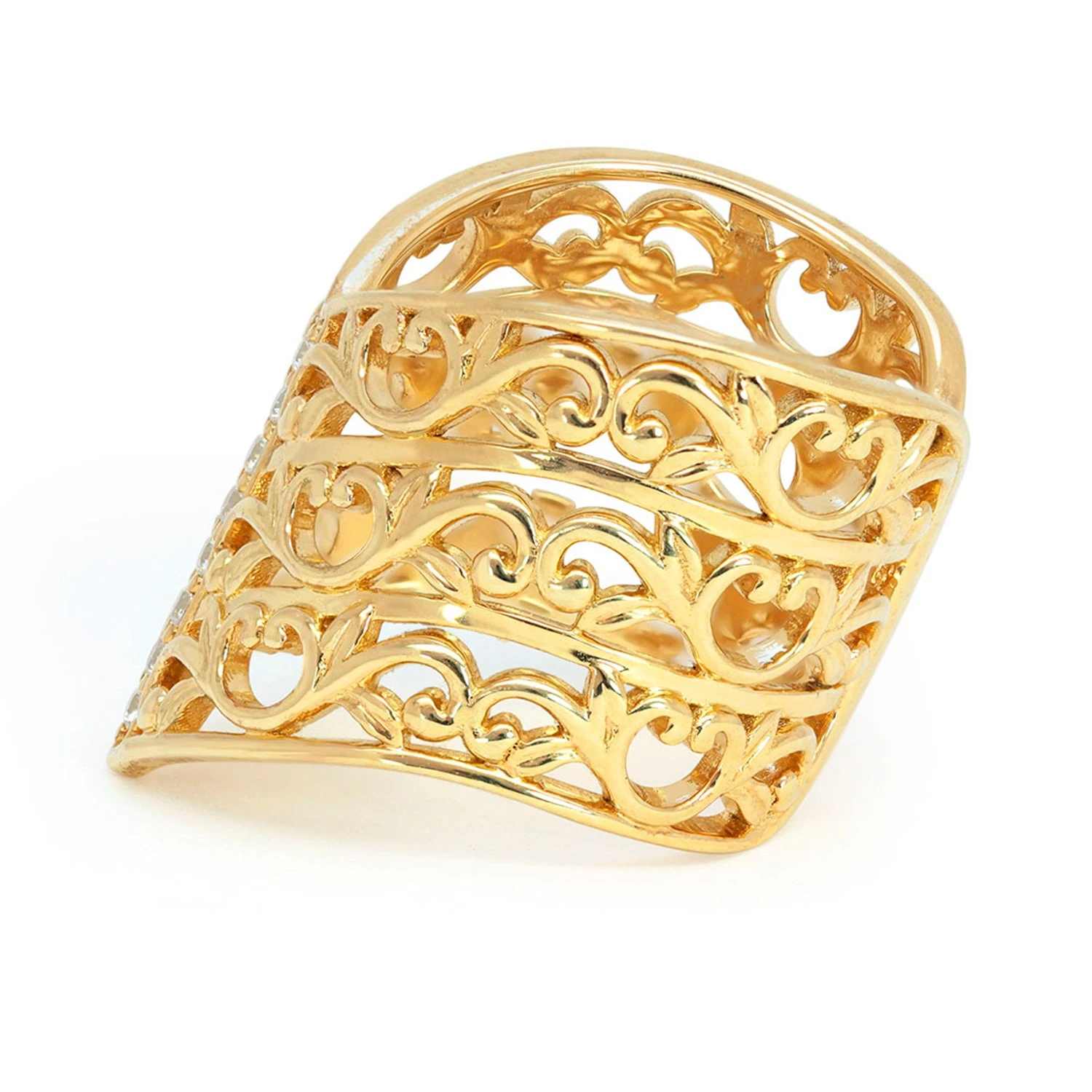 A jacket ring – or ‘ring enhancer’ – exists to embrace an engagement ring’s contours like a tailored party dress. Its purpose is to intensify and elaborate, drawing attention to its partnered jewel whilst steering its style in a new and exciting direction. Designed in tandem with the timeless engagement rings of our complimentary Artisan Collection, this substantial piece is best worn as an embellishment of another. Whilst the nadir of its wishbone shape is designed to cradle a solitaire diamond, florid filigree-inspired scrolls sweep through both sister collections in a nod to the Spanish heritage of our Creative Director, Arabel Lebrusan. Whether introduced solo in the first instance or incorporated into an ornate stack, this ring promises to create a party on your finger with your engagement ring at its very centre.