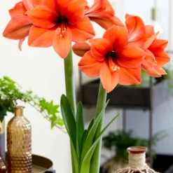 Jumbo Amaryllis Orange Desire is a very distinctive variety of amaryllis, featuring giant smouldering orange blooms on tall, sturdy stems. This spectacular flower will liven up even the drabbest of days and will remain in bloom for several weeks.