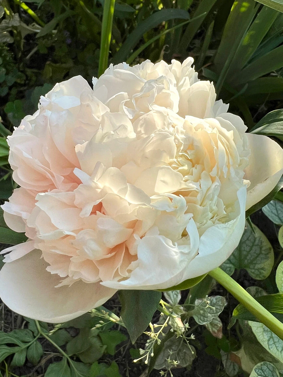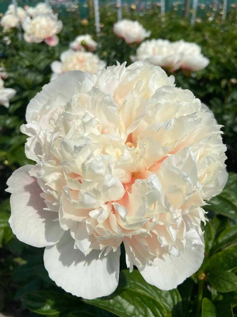 Colonel Owen Cousins presents white flowers with a salmon pink glow and the coveted bomb shape. This peony stands out with its immense flower buds.
